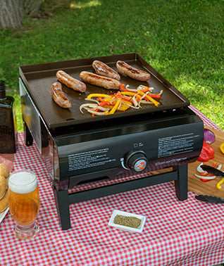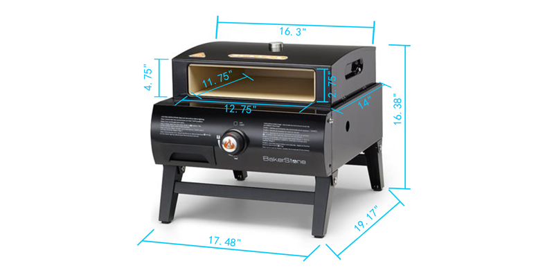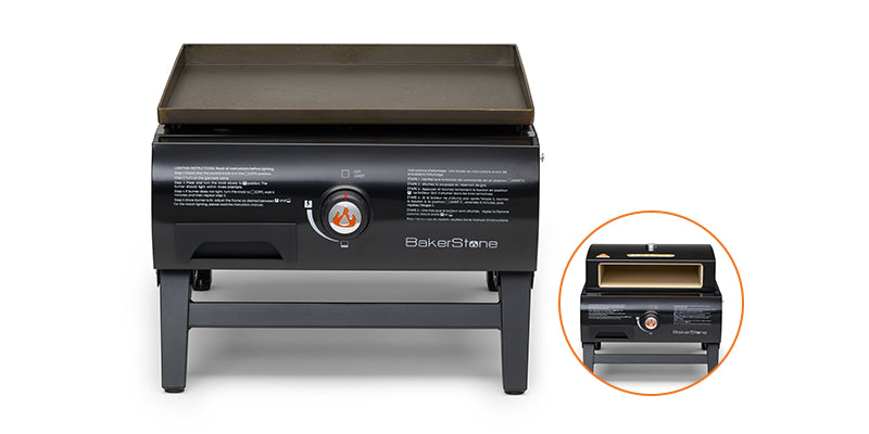 Enjoy delicious, wood-fire-style pizza and oven roasted delicacies with the Pizza Oven Box in place or cook a variety of foods with the griddle in place. - This product includes a 20,000BTU firebox utilizing a large stainless steel burner plus the Basics Series Pizza Oven Box that can be removed from the firebox and used as a grill top accessory. The Pizza Oven Box can be placed on the cooking surface of most 2 burner or larger gas grills and charcoal grills generating a wood-fired like cooking environment. - The Patented ceramic + stainless steel baking chamber of the Pizza Oven Box, and radiant heat transfer to quickly and evenly cook a variety of foods. Inside, just like a traditional wood-fired pizza oven. It is not just for pizza either. Be sure to wow the crowd at your next cookout by using the BakerStone Portable Gas Pizza Oven Box to bake bread and cookies, sear off steaks, or serve up an assortment of oven-roasted meat, fish, and vegetables. - As well, simply remove the Pizza Oven Box and replace with the Heavy Duty Griddle (included) to transform the Portable Gas Pizza Oven into a Portable Gas Griddle!