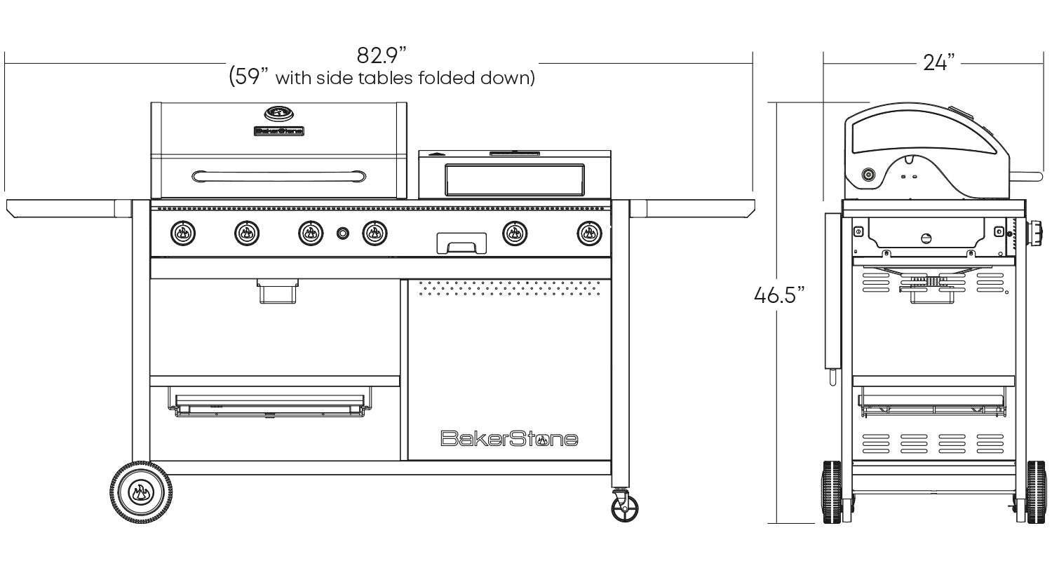 The BakerStone Original Series Outdoor Multi-Function Cooking Center does it all! The Gas Grill has four stainless steel burners totaling 44,000 BTUs of cooking power. The enameled cast iron cooking grates sear foods to lock in juices and flavour. The Secondary firebox consists of two stainless steel burners totaling an additional 25,000 BTU that power the BakerStone Original Series Pizza Oven Box or Heavy Duty Steel Griddle…both included. The BakerStone patented 5-sided stone baking chamber of the Pizza Oven Box utilizes convective, conductive, and radiant heat transfer to quickly and evenly cook a variety of foods. Inside, it can reach temperatures up to 900ºF to bake pizzas in under 4 minutes, just like a traditional wood-fired pizza oven. It is not just for pizza either. Be sure to wow the crowd at your next cookout by using the BakerStone Pizza Oven Box to bake bread and cookies, sear off steaks, or serve up an assortment of oven-roasted meat, fish, and vegetables. As well, the Original Series Cooking Center can be converted to a gas griddle by removing the Pizza Oven Box (included) and replacing it with the BakerStone Original Series Steel Griddle (included).