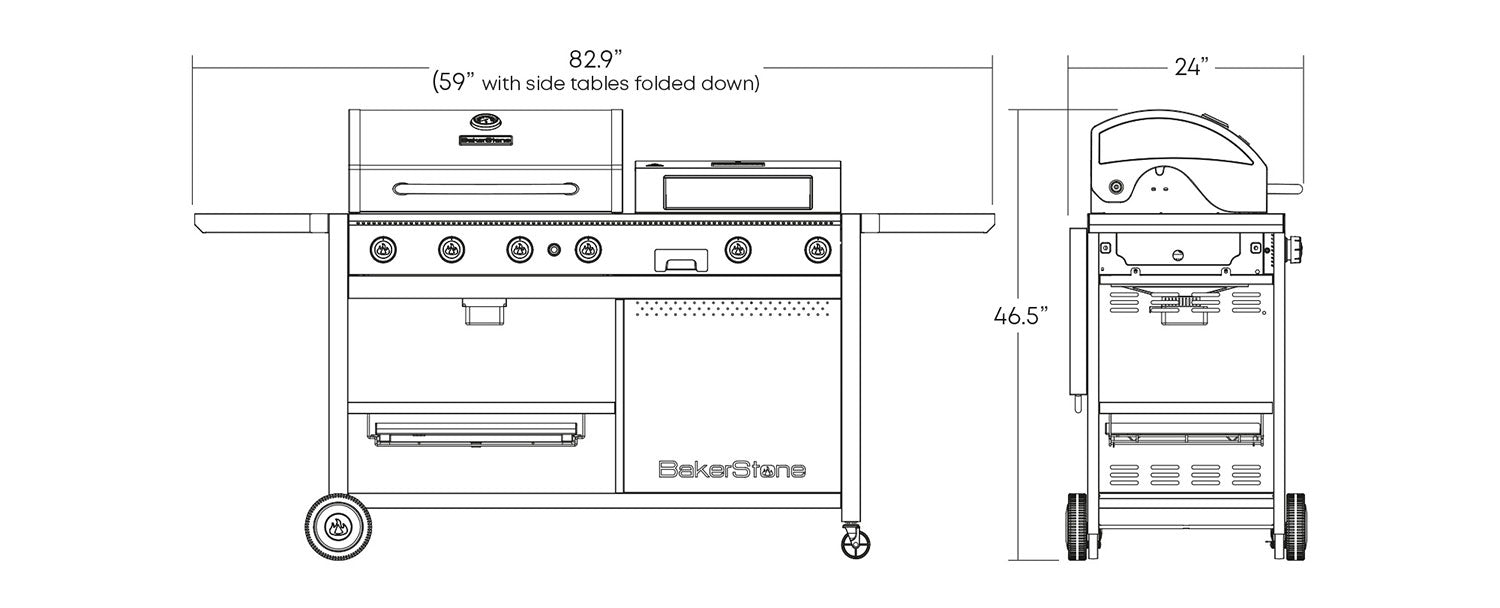 The BakerStone Original Series Outdoor Multi-Function Cooking Center does it all! The Gas Grill has four stainless steel burners totaling 44,000 BTUs of cooking power. The enameled cast iron cooking grates sear foods to lock in juices and flavour. The Secondary firebox consists of two stainless steel burners totaling an additional 25,000 BTU that power the BakerStone Original Series Pizza Oven Box or Heavy Duty Steel Griddle…both included. The BakerStone patented 5-sided stone baking chamber of the Pizza Oven Box utilizes convective, conductive, and radiant heat transfer to quickly and evenly cook a variety of foods. Inside, it can reach temperatures up to 900ºF to bake pizzas in under 4 minutes, just like a traditional wood-fired pizza oven. It is not just for pizza either. Be sure to wow the crowd at your next cookout by using the BakerStone Pizza Oven Box to bake bread and cookies, sear off steaks, or serve up an assortment of oven-roasted meat, fish, and vegetables. As well, the Original Series Cooking Center can be converted to a gas griddle by removing the Pizza Oven Box (included) and replacing it with the BakerStone Original Series Steel Griddle (included).