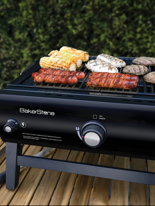 The BakerStone Original Series Portable Gas Grill lets you enjoy delicious grilled food anytime, anywhere. This product includes a powerful 25,000BTU firebox utilizing 2 stainless steel burners plus the Original Series Heavy Duty Cast Iron Cooking Grates for ultimate heat retention and searing of foods. As well, the Original Series Portable Gas Grill can be converted to a Portable Gas Pizza Oven by removing the cast iron cooking grates and replacing them with the BakerStone Original Series, Professional Series or Commercial Series Patented Pizza Oven Box (Sold Separately) or converted to a Portable Gas Griddle by removing the cast iron cooking grates and replacing them with the BakerStone Original Series Cast Iron Griddle (Sold Separately).