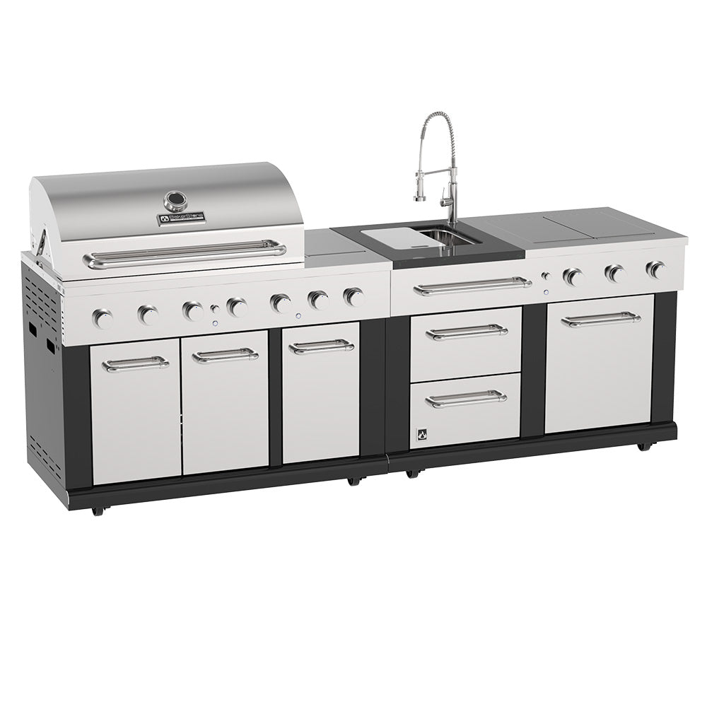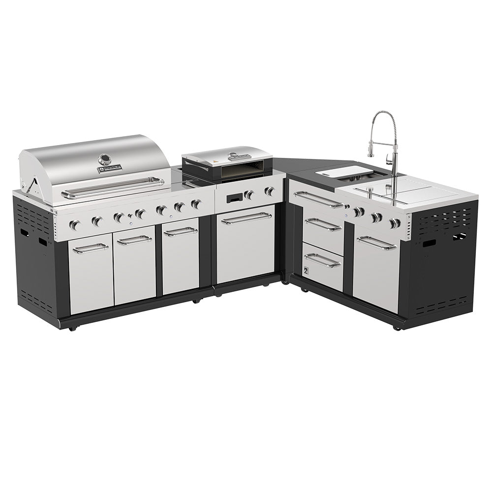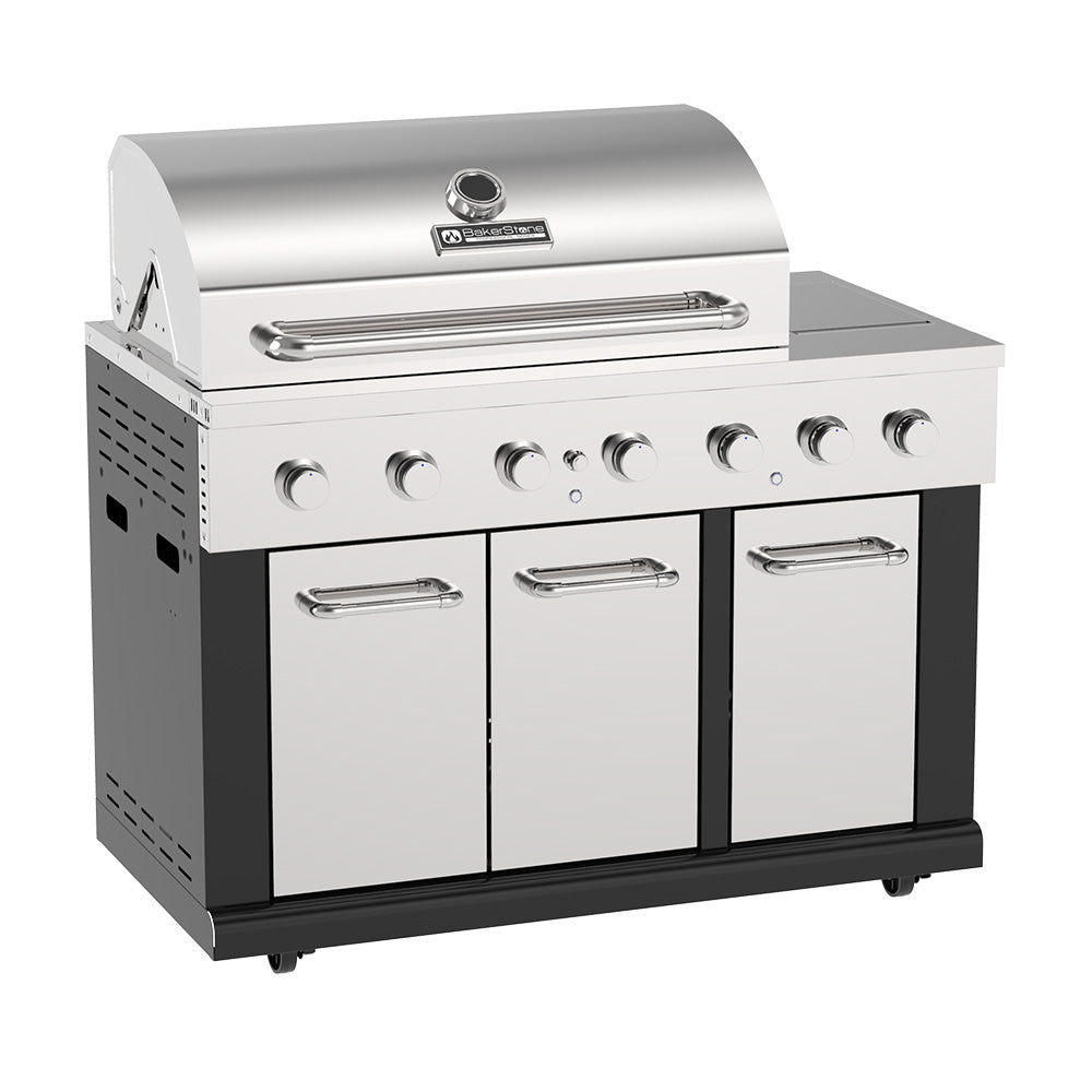 Spoil yourself with the ultimate Outdoor Kitchen. It all starts with the BakerStone 5 burner premium gas grill module. No corners were cut when this grill was designed! This grill is powered by 5 main heavy duty cast iron burners for the ultimate in longevity. Each main burner boasts 12,000 BTU for a total of 60,000 BTU for just the main grilling area. The burners are shielded by heavy gage stainless steel flame tamers that evenly distribute heat across 650 square inches of super heavy duty stainless steel cooking grates. These stainless steel grates are excellent for heat retention, searing foods and locking in juices. This grill also includes a 10,000 infrared ceramic rotisserie burner with a premium rotisserie kit included, and a 12,000 BTU infrared ceramic side burner and a heavy duty stainless steel trivet for ultimate high heat searing.