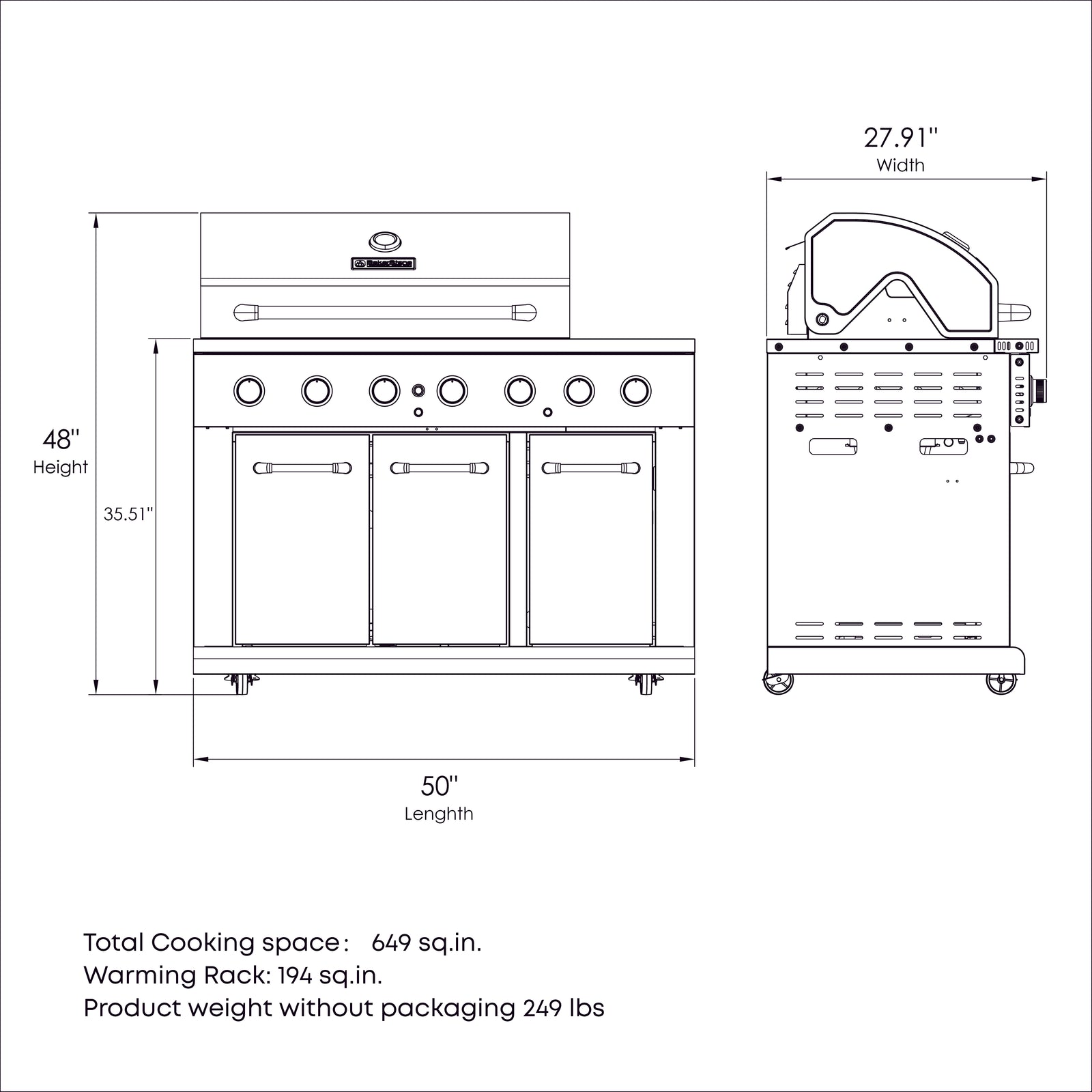 The features of this amazing grill are endless. The main grill features 2 halogen lights and LED backlit control knobs for anytime grilling. This grill is ready to use with liquid propane and includes a natural gas convesion kit. An in-cabinet propane cyliner slide out (cylinder sold separately) is included for ease of access when using the grill with propane. Protect your investment with the included grill cover.